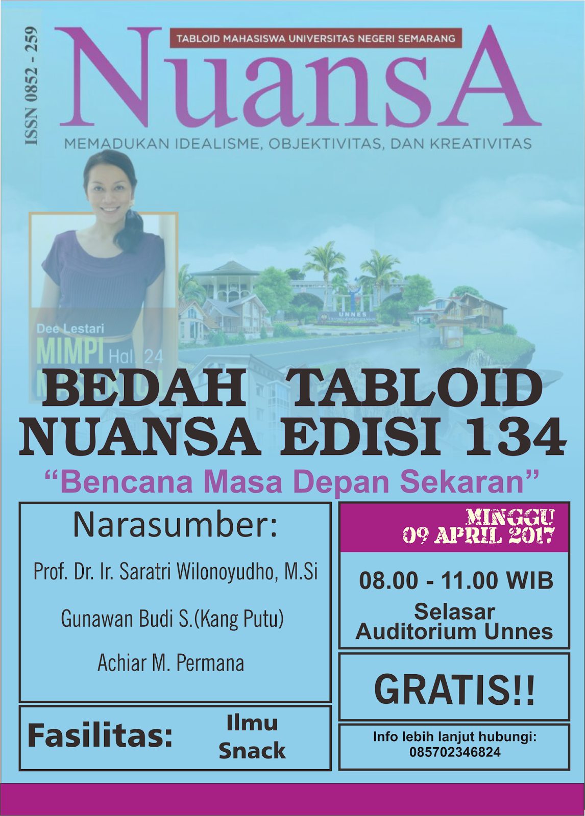 Badan Penerbitan dan Pers Mahasiswa Unnes Divisi Tabloid NuansA mengadakan Bedah Tabloid yang akan dilaksanakan Minggu, (09/04/2017) di Selasar Gedung Auditorium Unnes, mulai pukul 08.00 WIB. GRATIS!