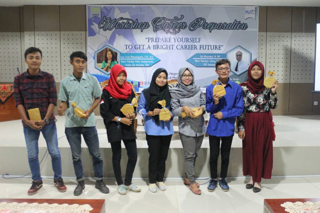 Lini Kampus – Human Resource Club (HRC) Fakultas Ekonomi Universitas Negeri Semarang (Unnes) mengadakan workshop dengan tema “Prepare yourself to get a bright career future”, Sabtu (6/5). Dengan mengundang dua pembicara Lucia Trisni Widyaningtanti, dosen Psikologi Universitas Katolik Soegijapranata Semarang sekaligus trainer SDM dan Eko Wianindiyo, Wakil Pemimpin Cabang BNI KCU Semarang.