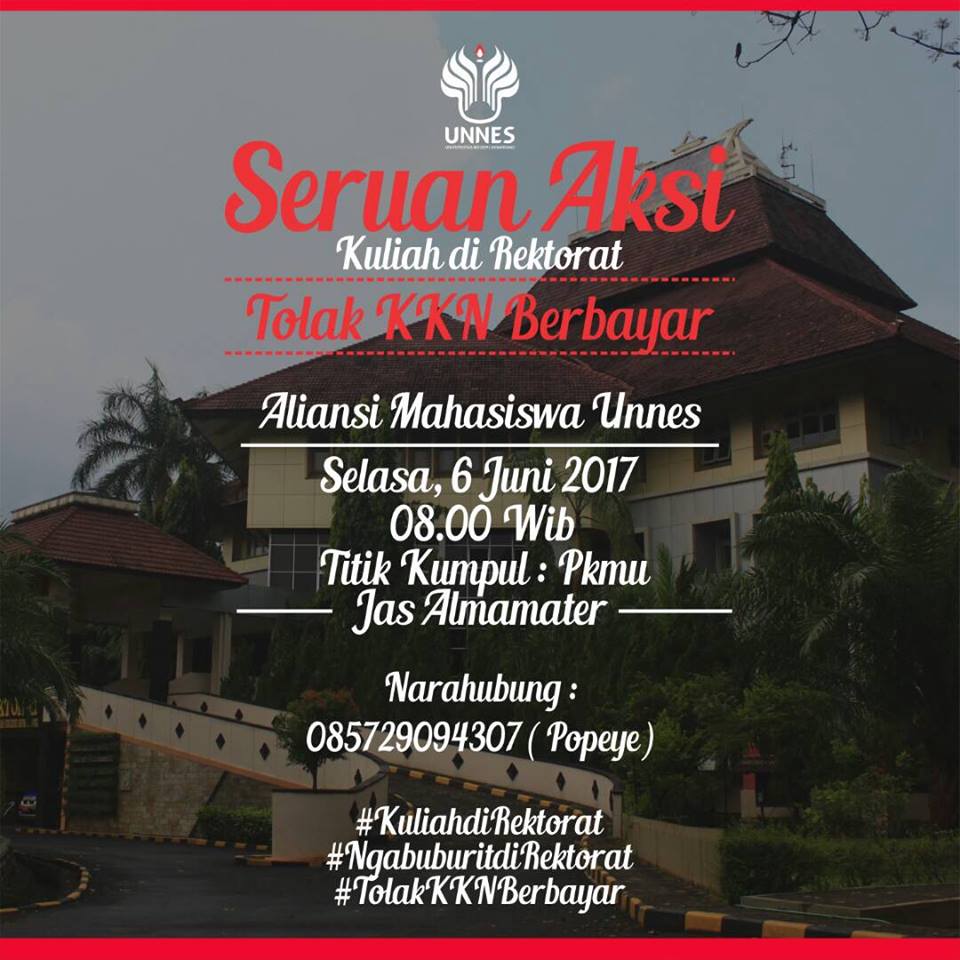 Aksi “Penolakan KKN Berbayar”, Rabu pagi (6/6), dilakukan di pelataran Gedung Rektorat. Atas nama Aliansi Mahasiswa Universitas Negeri Semarang (Unnes) dengan pihak birokrasi telah terjadi audiensi yang menghasilkan keputusan bahwa universitas akan membantu memfasilitasi transportasi penerjunan dan penarikan peserta KKN (secara kelompok) dan snack pembekalan. Surat pernyataan ini legal karena tersemat tanda tangan Rektor Unnes. Namun, sayangnya legalitas Rektor tidak mempengaruhi proses kerja Satuan tugas KKN.