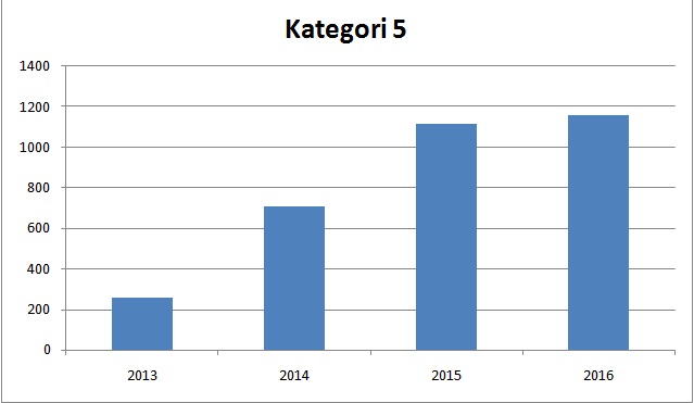 Kategori 5 dari tahun 2013 hingga 2014 sebaliknya dari empat kategori sebelumnya. Pada tahun 2013 mahasiswa penerima kategori 5 yakni 257, pada tahun 2014 angka ini meningkat menjadi 707. Demikian pada dua tahun terakhir menunjukkan peningkatan berturut-turut yakni dalam angka 1116 dan 1157 mahasiswa. Biaya UKT kategori lima yakni terendah 4,5 juta, tertinggi 5,5 juta rupiah.