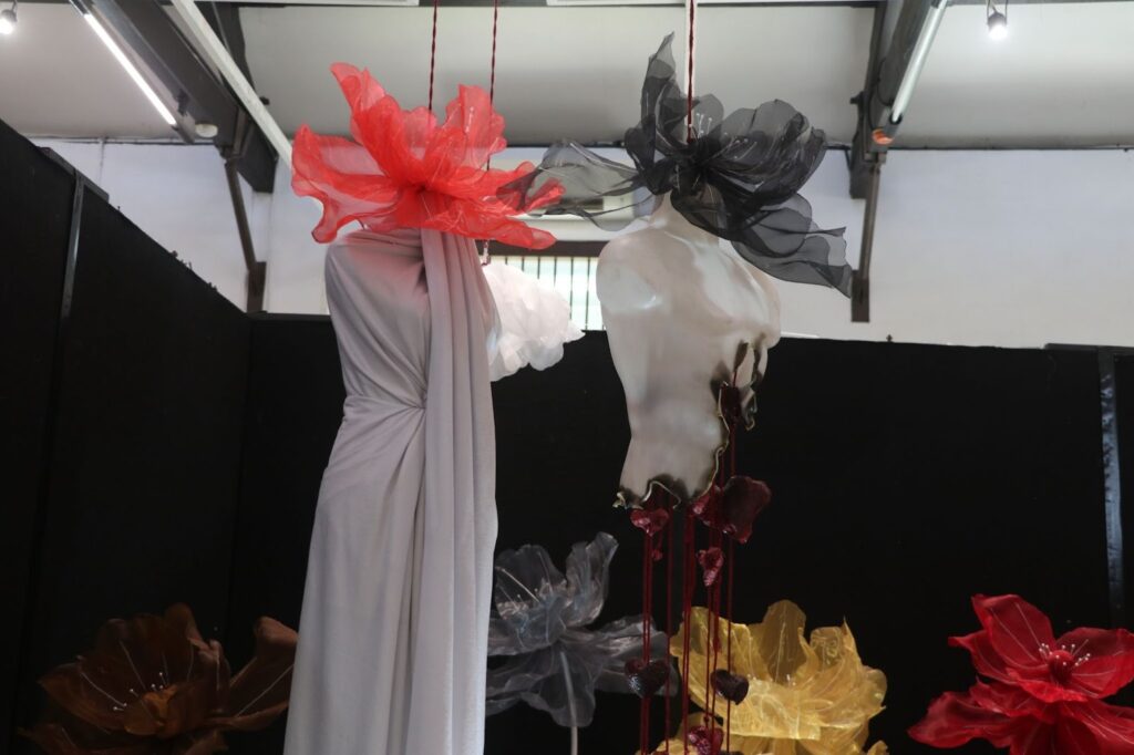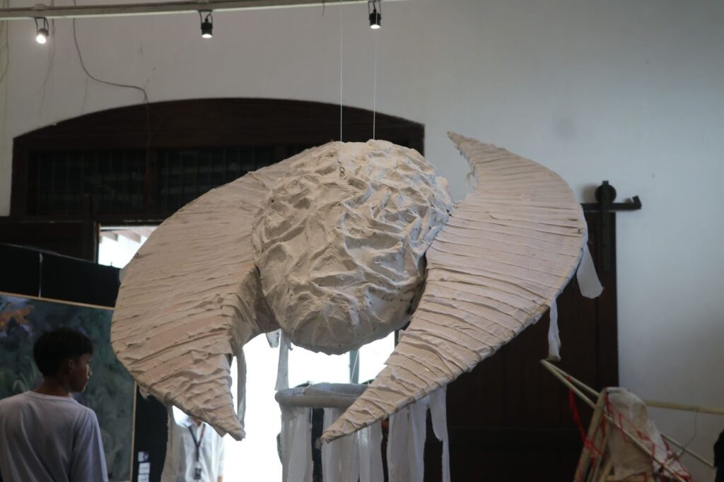 Di sudut ruang pameran, sebuah instalasi berjudul “Cakra” oleh Lutfiah dan Salma mengisahkan perjalanan hidup manusia dari lahir hingga meninggal, Minggu (30/11/2025) [Merisa/BP2M]
