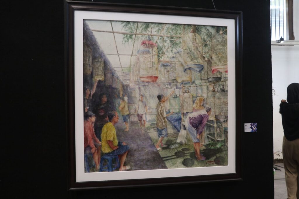 Lukisan Karya Musik Mustiko dengan judul “Nge’ker” yang menggambarkan kebiasaan pecinta burung mengamati burung dari jauh untuk melihat gerak-gerik, suara, dan mental pada burung saat didekati orang, Minggu (30/11/2025) [Nadya/BP2M]