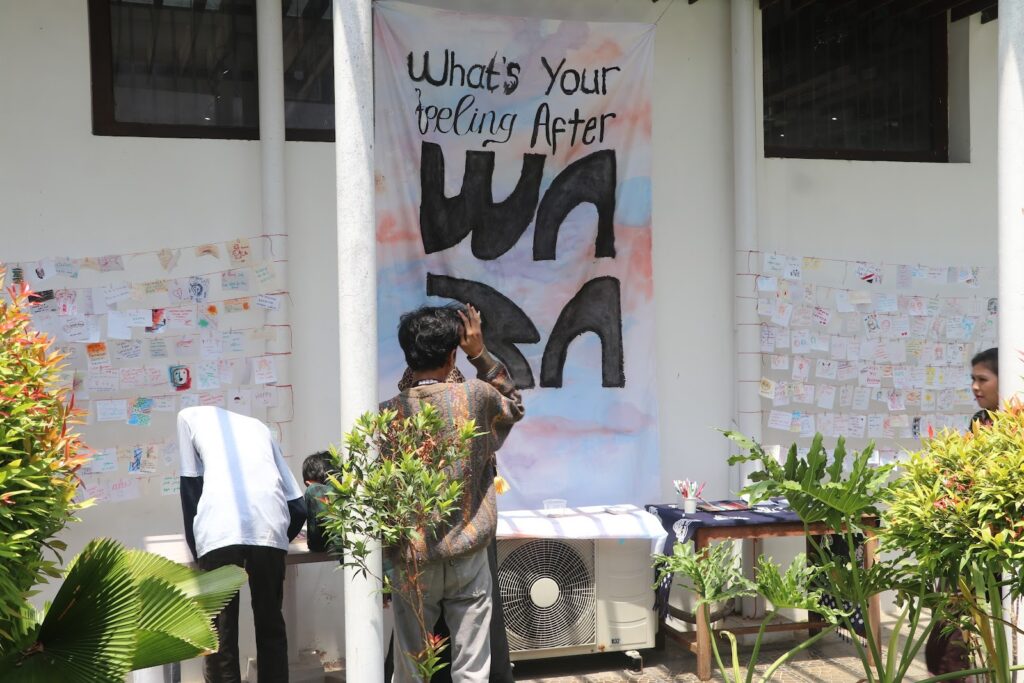 Di jalur keluar pameran, beberapa pengunjung tampak sedang menulis kesan dan perasaan setelah menikmati pameran di kertas-kertas yang telah disediakan, Minggu (30/11/2025) [Husain Akmal F/BP2M]