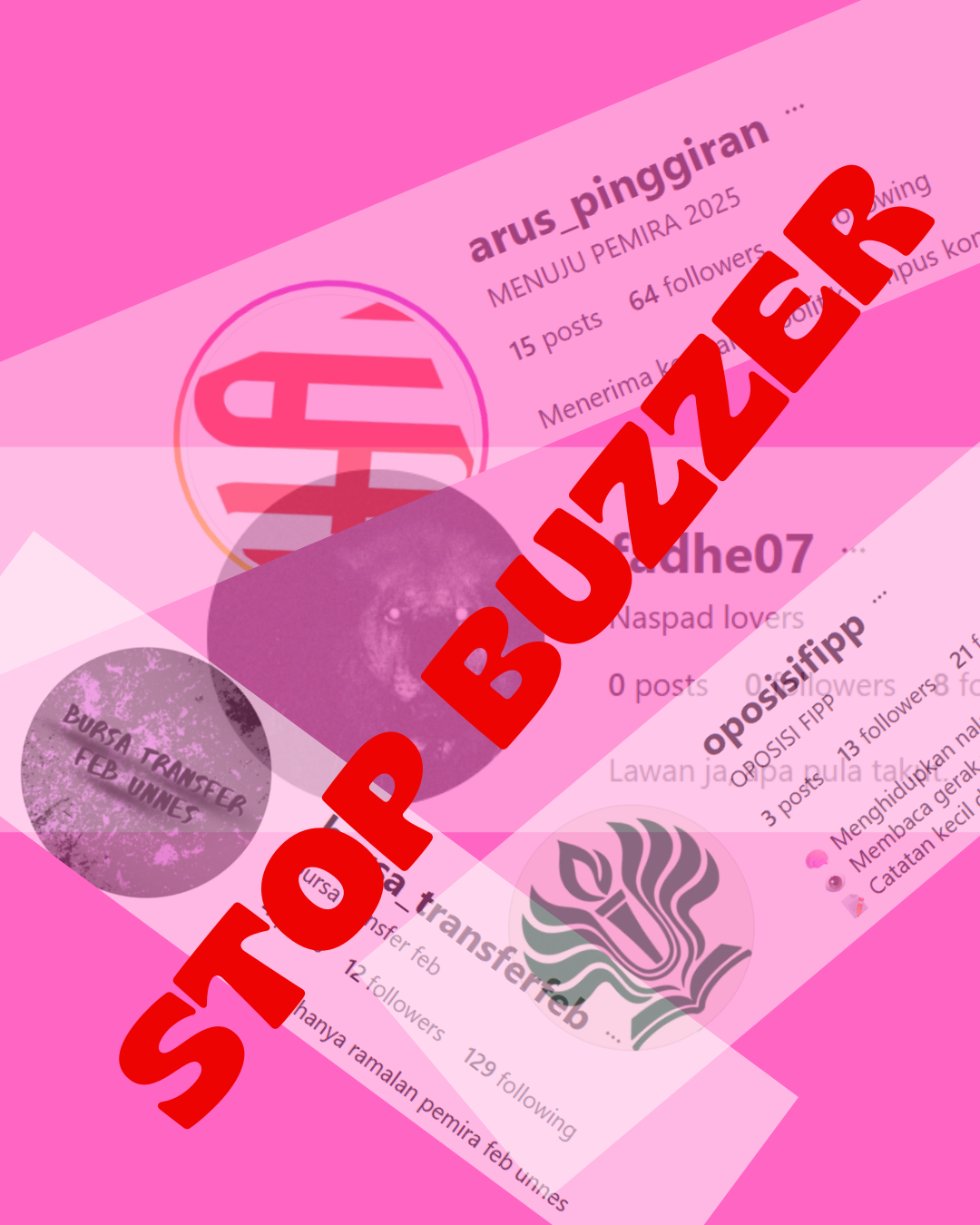 Buzzer bekerja hanya untuk tujuan menggiring opini bukan menguji gagasan. Pecundang politik tersebut mengubah percakapan publik di sosial media yang seharusnya penuh dengan ide dan gagasan menjadi ruang manipulasi, misinformasi, hoax, dan negative campaign. Hal tersebut menghilangkan kejujuran demokrasi dan menjadikan mahasiswa sama dengan pejabat busuk yang melakukan hal serupa untuk menipu konstituen melalui penggiringan opini, misinformasi, dan negative campaign. Kontestasi busuk akan melahirkan kepemimpinan busuk.