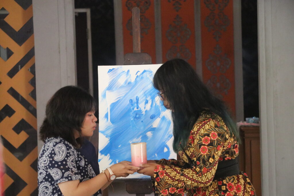 Lilin terbesar diserahkan kepada Ketua UKM Seni Rupa dan Desain Retno Sekar Kinasih dan Ketua Pelaksana Dinarszade Aqilla, lalu ditiup bersama sebagai simbol peresmian ARTBILITY 6, Rabu (11/2/2026) [BP2M/Haidar Ali]