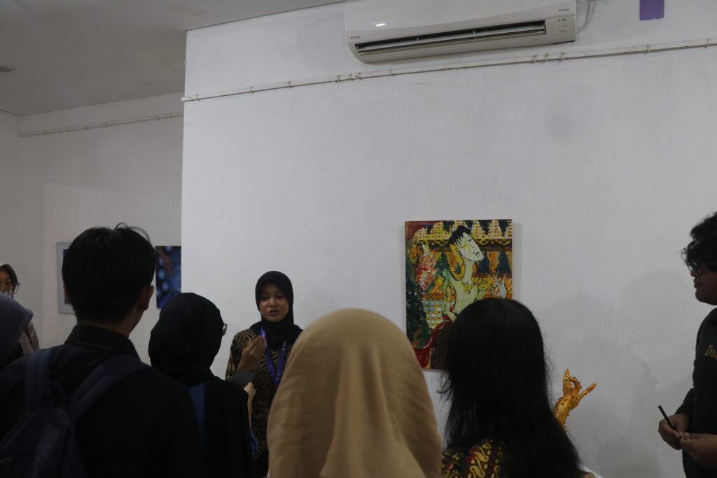 Seorang panitia sedang menjelaskan latar penciptaan dan makna karya membantu pengunjung memahami pesan yang ingin disampaikan seniman, Rabu (11/2/2026)