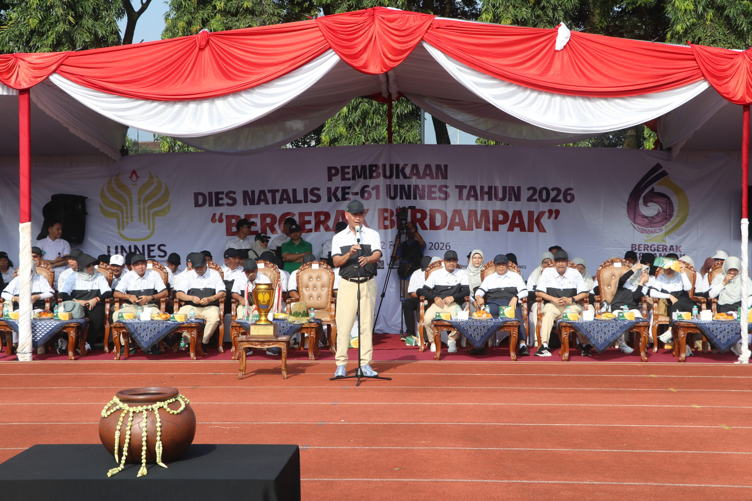 Perayaan Dies Natalies Universitas Negeri Semarang (Unnes) Ke-61 berlangsung meriah pada Kamis (12/2/2026). Acara dimulai dengan senam bersama di Lapangan Prof. Dirham dengan Prosesi Kirab Budaya “Tirta Jagadpradipa” yang diikuti oleh sembilan fakultas. Seremonial pembukaan dimulai dengan sambutan oleh Rektor Unnes, Prof. S. Martono M. Si., dilanjutkan dengan peresmian sebagai tanda dimulainya acara. Jalan sehat bersama dari Lapangan Prof. Dirham menuju Lapangan Rektorat serta penerimaan kupon doorprize untuk civitas akademika Unnes di area FBS.