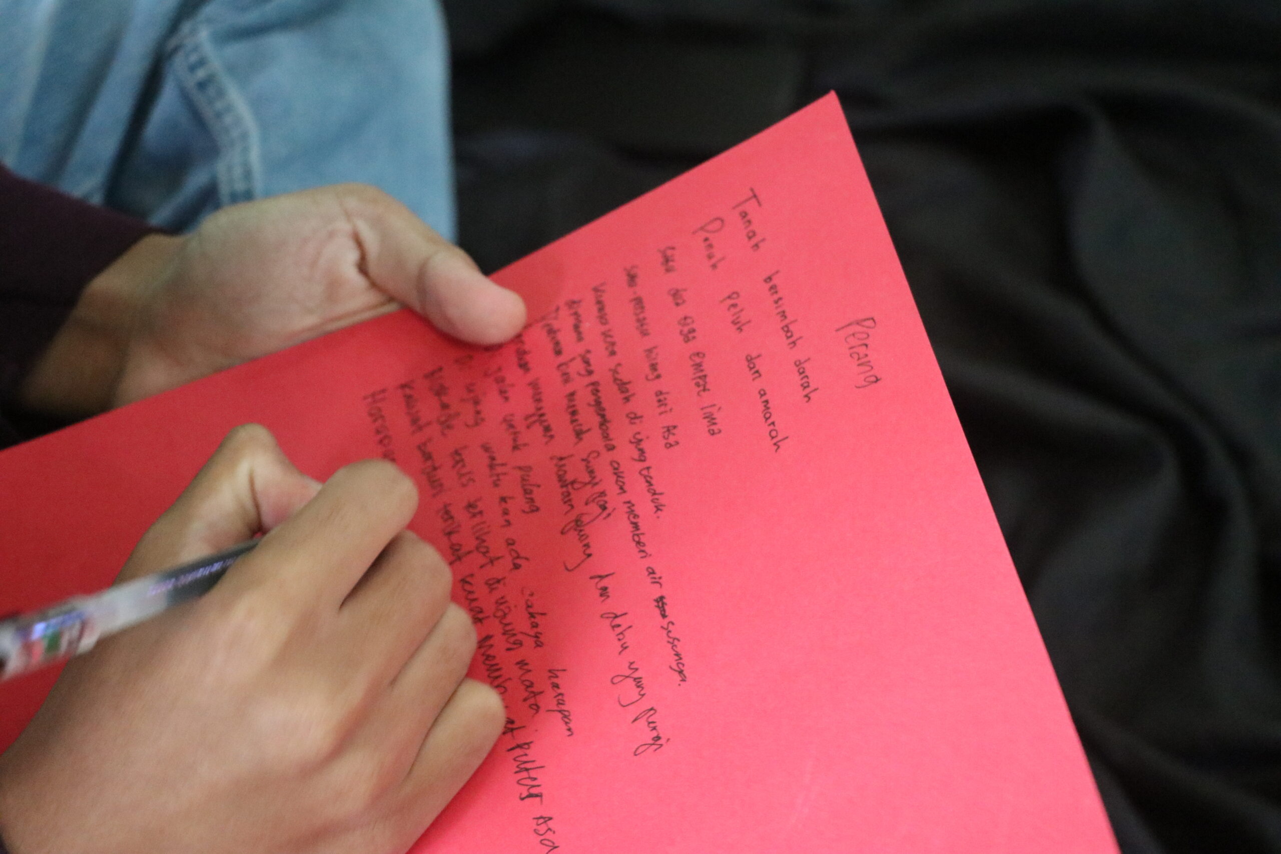 Peserta saling berinteraksi melalui permainan menyusun puisi secara berkelompok. Peserta yang hadir diarahkan untuk berkelompok sesuai dengan warna kertas yang didapat pada saat pendaftaran. Setelahnya, mereka diberi waktu 30 menit untuk bekerja sama menyusun puisi. Setiap kelompok diinstruksikan untuk menampilkan pembacaan hasil puisi, dan kelompok lain menyimak serta memberikan komentar atas penampilan masing-masing kelompok. Kegiatan ini ditutup dengan pemberian kesan pesan dari peserta dan panitia.